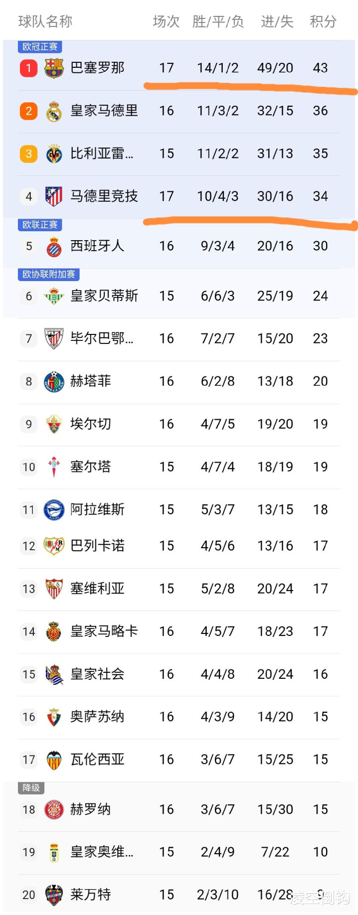 今天凌晨,西甲第16轮适度了4场较量,这三场比赛适度之后,西甲当今最新的积分榜得到更新,咱们来望望具体的西甲积分名次情况。