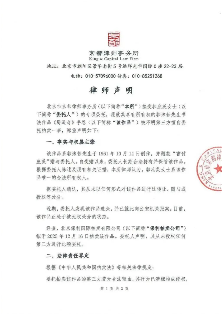 近日,郭沫若书道手卷《蜀谈奇》将亮相北京保利二十周年秋拍,12月16日开拍,起拍价800万元。其女郭庶英寄予讼师发布声明,称该作品为父亲1961年题赠我方的私藏,从未转让或授权,现在已遗失并报警,质疑拍卖为无权刑事背负,条款保利中止拍卖、返还作品。