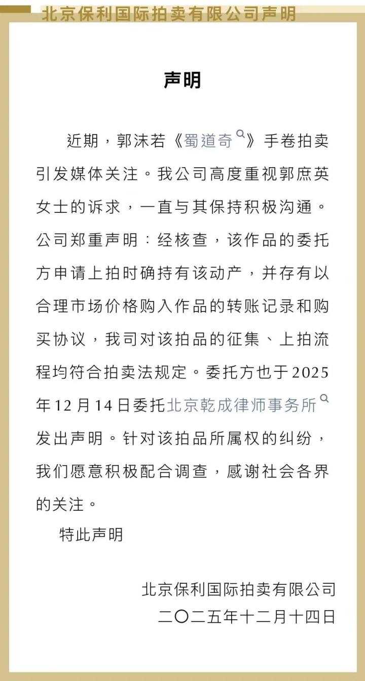 “郭沫若男儿已报警”, 北京保利拍卖发声